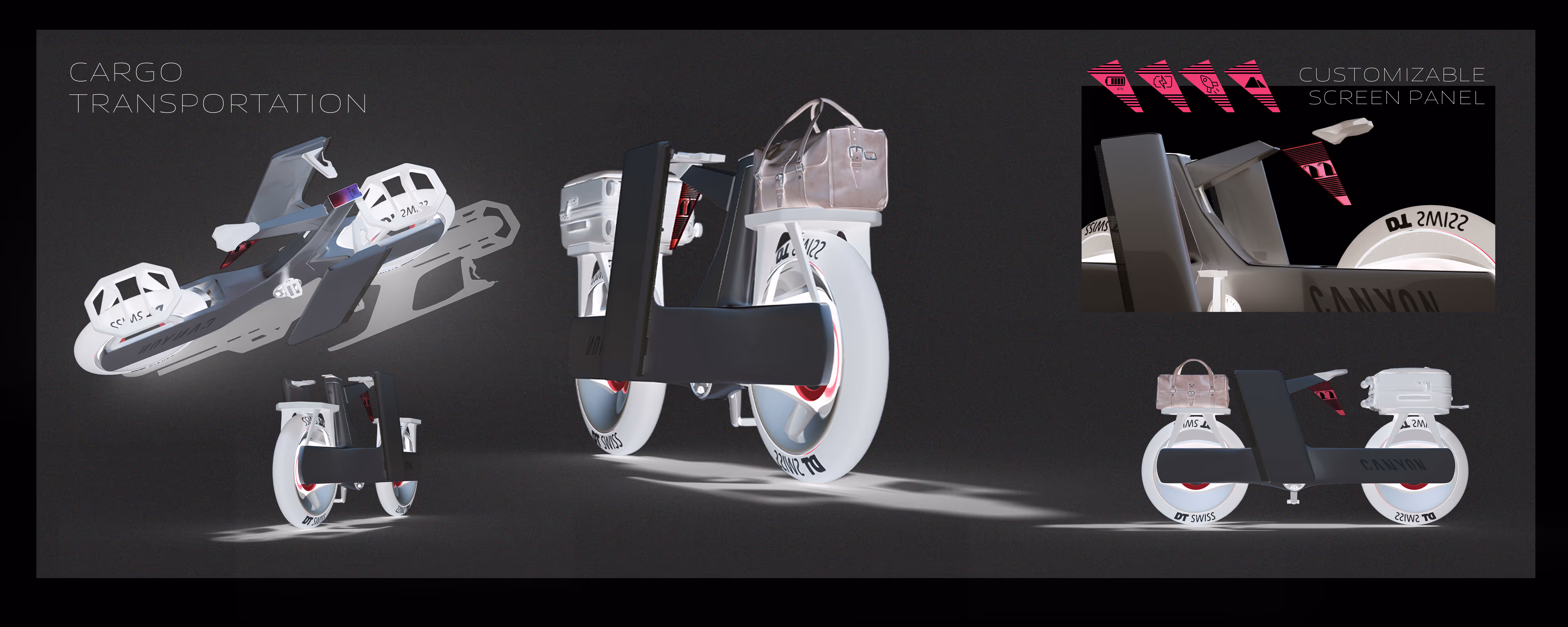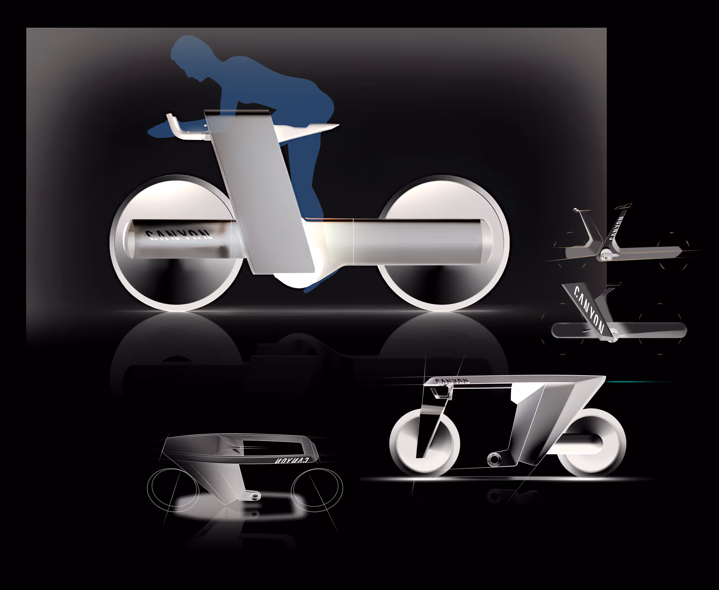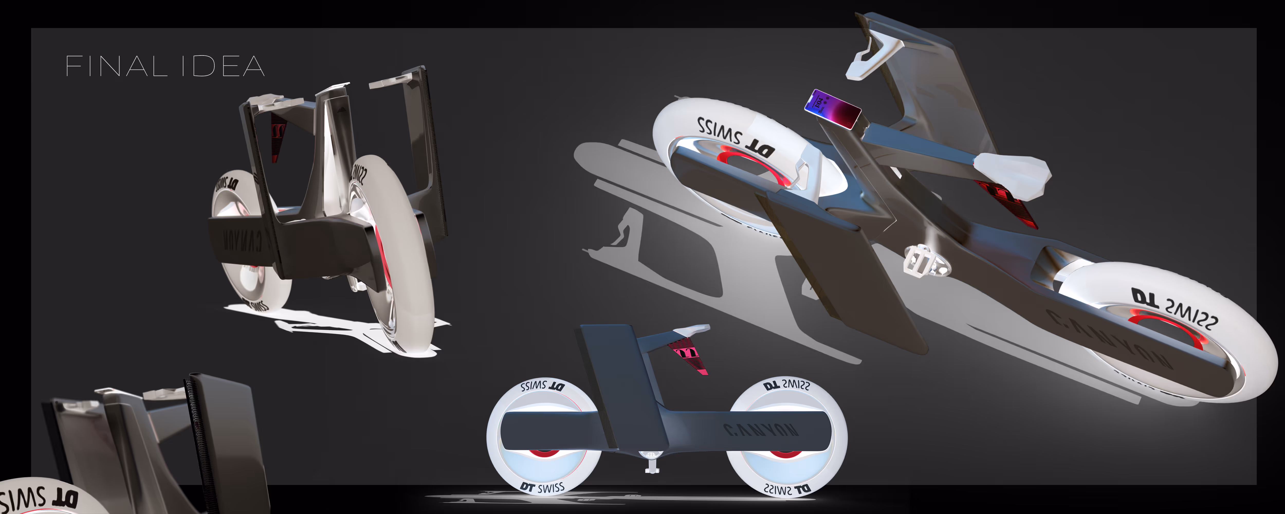 during the third semester, the Canyon Hyper Bike was created as a collaborative project exploring the limits of performance in cycling.The concept envisions a hyper bike capable of reaching significantly higher speeds than conventional bicycles potentially extending into high-speed environments such as the Autobahn. This raised a key challenge: safety at extreme speeds.To address this, the design introduces “safety blades” integrated structural elements designed to manage and redirect impact forces. These components are not only functional but also shape the visual identity of the bike.The workflow began with hand sketches, followed by digital refinement in Photoshop. Initial 3D development was done in Autodesk Alias, and later transitioned to Blender for faster iteration and visualization. The final model and animation were completed in Blender.